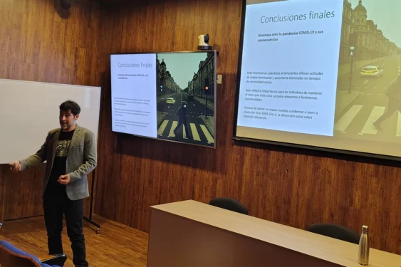 Durante la jornada, el Dr. Méndez expuso cómo las crisis, como la vivida durante la pandemia de COVID-19, generan una sensación de amenaza —biológica y social— y de caos social (anomía), lo que favorece la percepción de que se requieren gobiernos fuertes y autoritarios. El estudio, realizado con muestras de Chile y España, evidenció que en nuestro país la amenaza social y la anomia fueron más intensas, especialmente ante el temor de perder el empleo y las condiciones de vida.