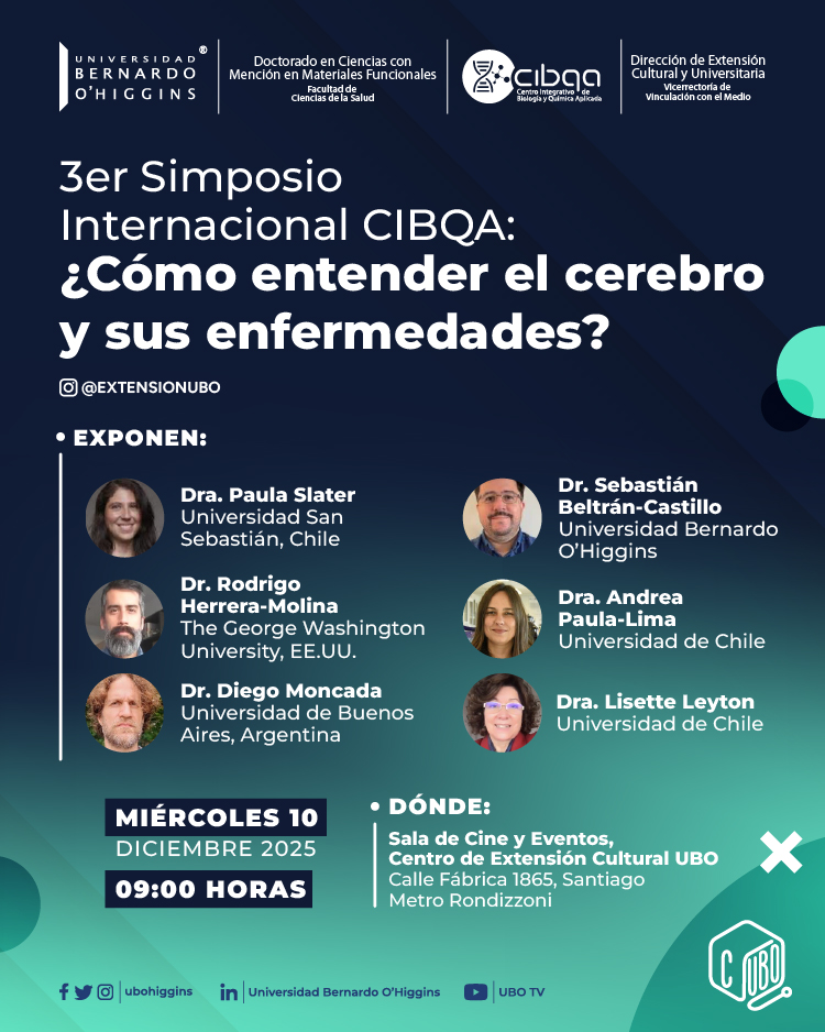 La Universidad Bernardo O’Higgins, a través del Centro Integrativo de Biología y Química Aplicada (CIBQA), en colaboración con el Doctorado en Ciencias con Mención en Materiales Funcionales, invita a la comunidad científica, académica y estudiantil a participar en el 3er Simposio Internacional CIBQA, titulado “¿Cómo entender el cerebro y sus enfermedades?”.