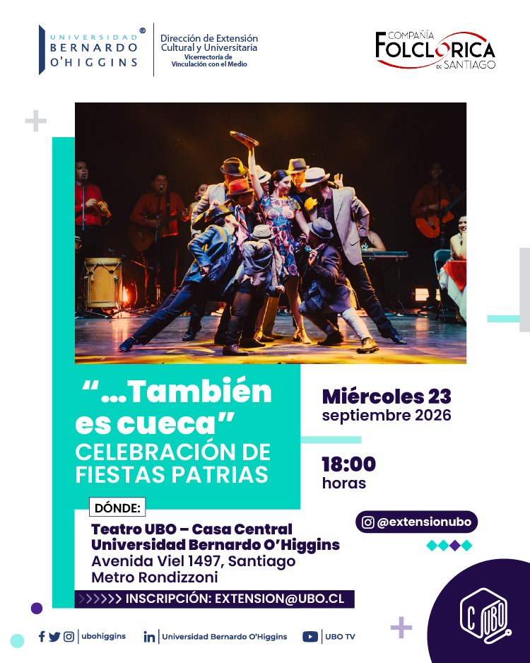 La Dirección de Extensión Cultural y Universitaria de la Universidad Bernardo O’Higgins, junto a la reconocida Compañía Folclórica de Santiago, invita a la comunidad a participar de la celebración de Fiestas Patrias “…También es cueca”, un espectáculo que pone en valor la cueca y las tradiciones del folclore nacional a través de la danza, la música en vivo y una puesta en escena llena de energía e identidad cultural.