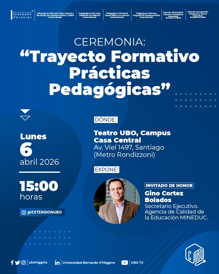 La Dirección de Extensión Cultural y Universitaria, en conjunto con la Escuela de Educación de la Universidad Bernardo O’Higgins, invita a la comunidad universitaria a participar en la ceremonia “Trayecto Formativo Prácticas Pedagógicas”, instancia orientada a relevar el proceso formativo de estudiantes en su vínculo con el ejercicio docente.