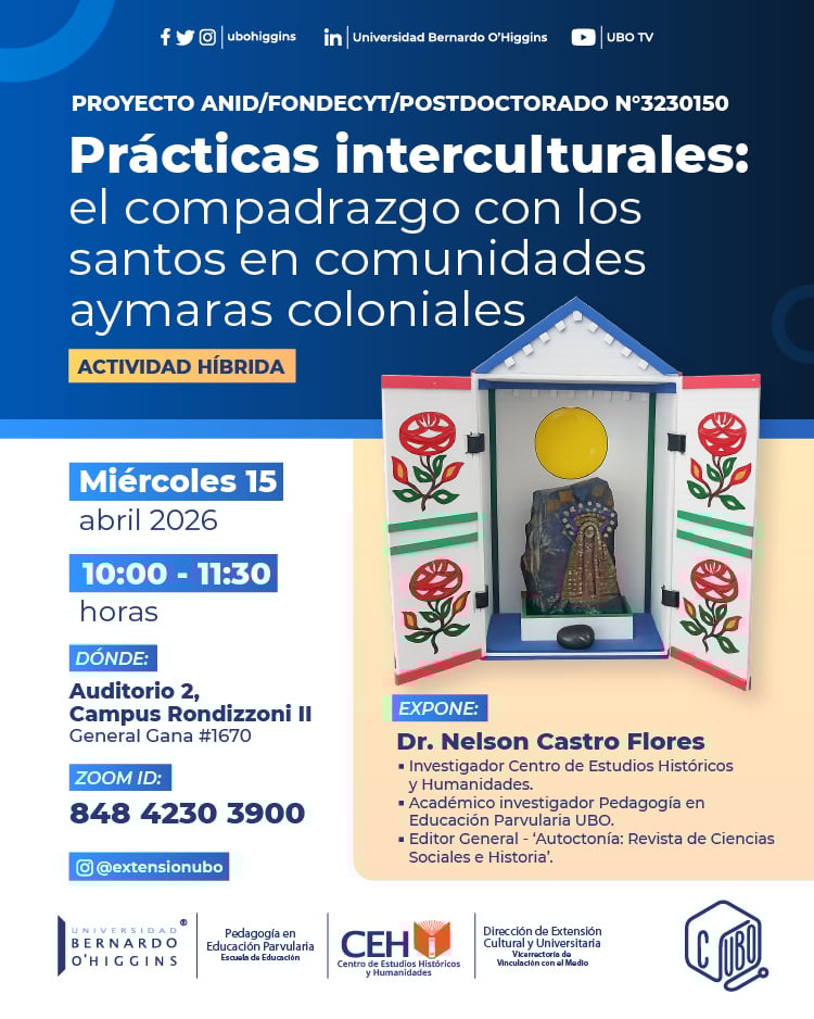 La Dirección de Extensión Cultural y Universitaria, en conjunto con la carrera de Pedagogía en Educación Parvularia y el Centro de Estudios Históricos y Humanidades de la Universidad Bernardo O’Higgins, invita a la comunidad universitaria y al público general a participar en la charla “Prácticas interculturales: el compadrazgo con los santos en comunidades aymaras coloniales”, en el marco del proyecto ANID/FONDECYT/Postdoctorado N°3230150.