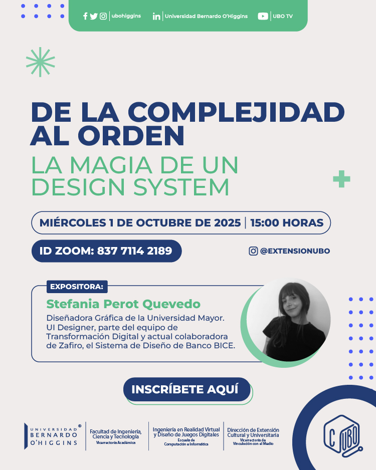 La Universidad Bernardo O’Higgins, a través de la Facultad de Ingeniería, Ciencia y Tecnología, junto a la carrera de Ingeniería en Realidad Virtual y Diseño de Juegos Digitales, y la Dirección de Extensión Cultural y Universitaria, invita a participar en la charla “De la complejidad al orden: la magia de un Design System”, una instancia que permitirá conocer cómo los sistemas de diseño transforman la manera de organizar y potenciar la experiencia digital.