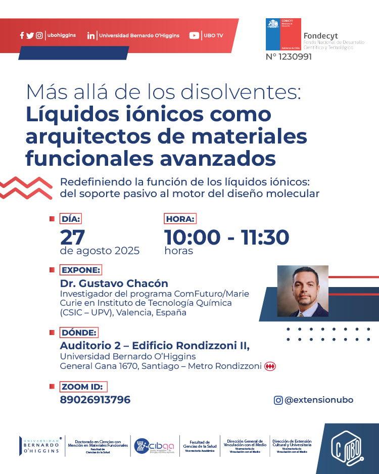 La Universidad Bernardo O’Higgins invita a la charla “Más allá de los disolventes: Líquidos iónicos como arquitectos de materiales funcionales avanzados”, dictada por el Dr. Gustavo Chacón, investigador del programa ComFuturo/Marie Curie en el Instituto de Tecnología Química (CSIC – UPV), Valencia, España.