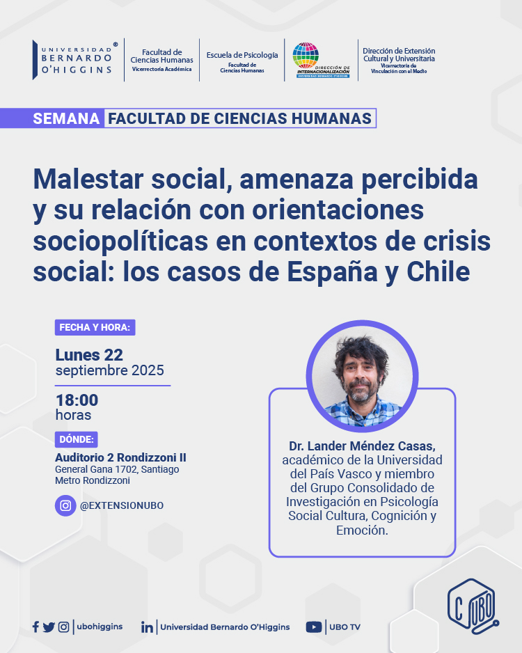 Durante la actividad se abordarán los vínculos entre el malestar social, la amenaza percibida y las orientaciones sociopolíticas en escenarios de crisis, tomando como referencia los contextos de España y Chile.