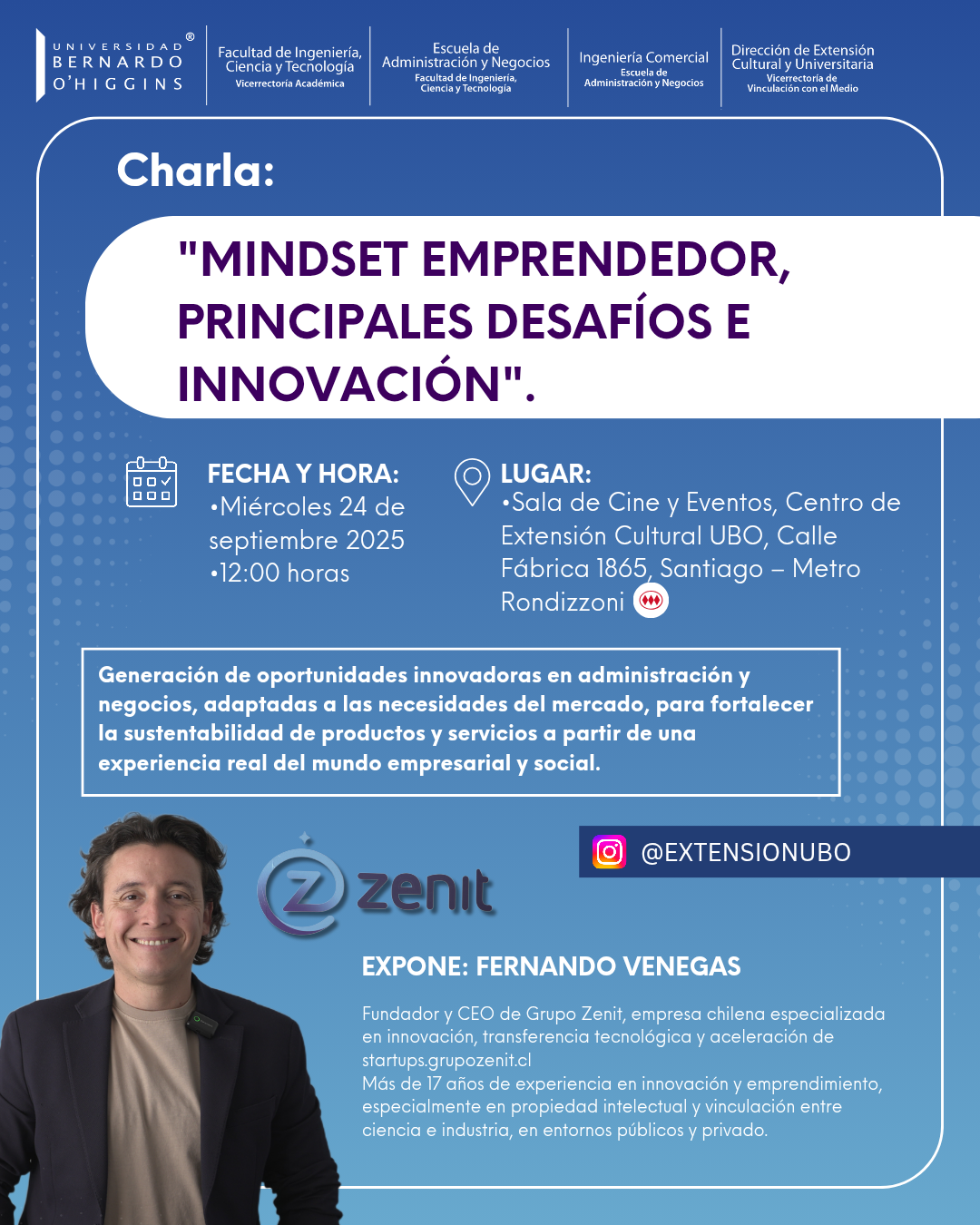 La actividad estará a cargo de Fernando Venegas, fundador y CEO de Grupo Zenit, empresa chilena dedicada a la innovación, transferencia tecnológica y aceleración de startups. Con más de 17 años de experiencia en emprendimiento e innovación, especialmente en propiedad intelectual y vinculación entre ciencia, industria y sector público, Venegas compartirá su visión sobre cómo fortalecer la sustentabilidad de productos y servicios a partir de la experiencia real en el mundo empresarial y social.