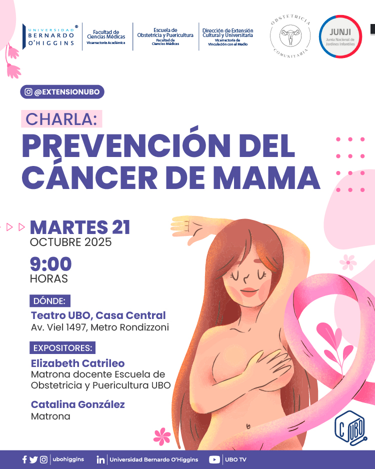 La actividad contará con la participación de Elizabeth Catrileo, matrona y docente de la Escuela de Obstetricia y Puericultura UBO, y Catalina González, matrona, quienes abordarán factores de riesgo, técnicas de autoexploración y la importancia del control médico preventivo.