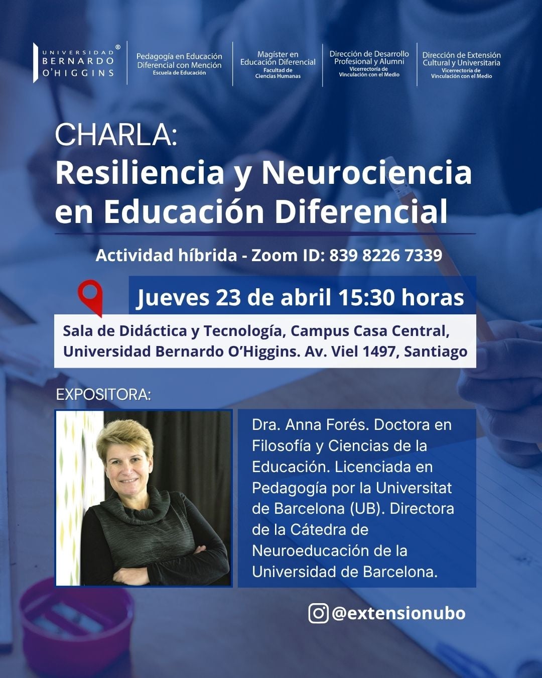 La charla se realizará en modalidad híbrida el jueves 23 de abril de 2026, a las 15:30 horas, en la Sala de Didáctica y Tecnología del Campus Casa Central de la Universidad Bernardo O’Higgins, ubicada en Av. Viel 1497, Santiago.