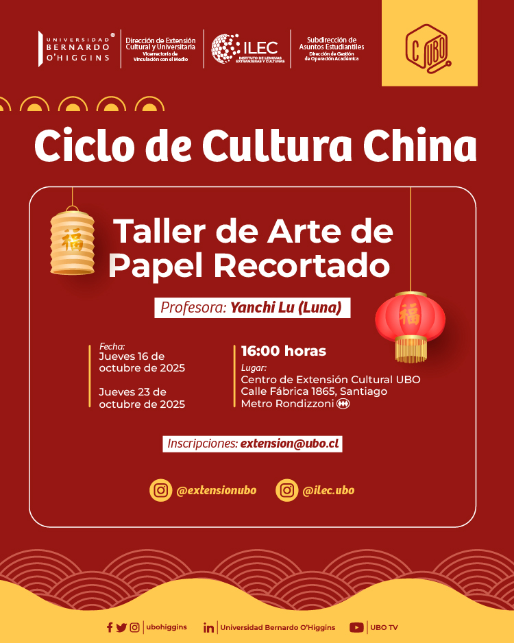 La Dirección de Extensión Cultural y Universitaria, el Instituto de Lenguas Extranjeras y Culturas (ILEC) y la Subdirección de Asuntos Estudiantiles invitan a participar en el Taller de Arte de Papel Recortado, una instancia para conocer y practicar una de las tradiciones más representativas de la cultura china, de la mano de la profesora Yanchi Lu (Luna).