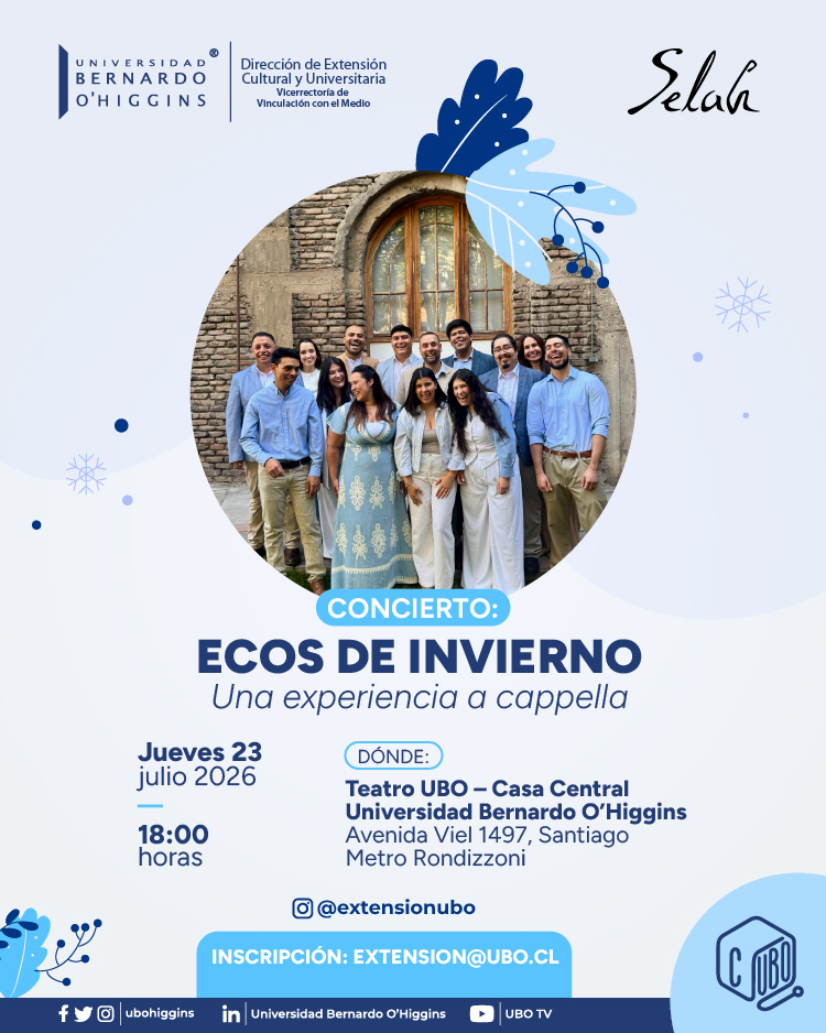 La Dirección de Extensión Cultural y Universitaria de la Universidad Bernardo O’Higgins invita a la comunidad a asistir al concierto “Ecos de Invierno: una experiencia a cappella”, una propuesta musical que ofrece un recorrido sonoro a través del canto vocal, destacando la armonía y expresividad de la interpretación sin acompañamiento instrumental.
