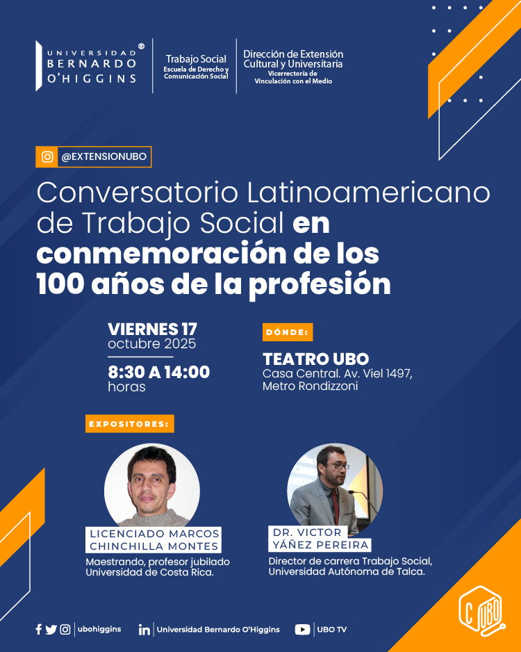 La Universidad Bernardo O’Higgins, a través de su Escuela de Derecho y Comunicación Social y la Dirección de Extensión Cultural y Universitaria, invita a participar en un espacio de diálogo y reflexión en torno al legado y proyección del Trabajo Social en América Latina, con motivo de la conmemoración de los 100 años de esta importante profesión.