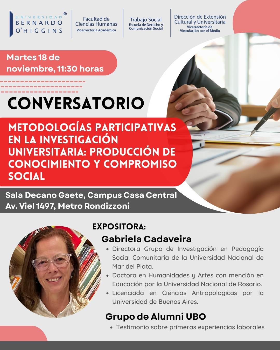 La Universidad Bernardo O’Higgins a través de la Dirección de Extensión Cultural y Universitaria y la carrera de Trabajo Social, invita a participar en este conversatorio que abordará el valor de las metodologías participativas como herramienta de construcción de conocimiento y fortalecimiento del vínculo entre la academia y la comunidad.