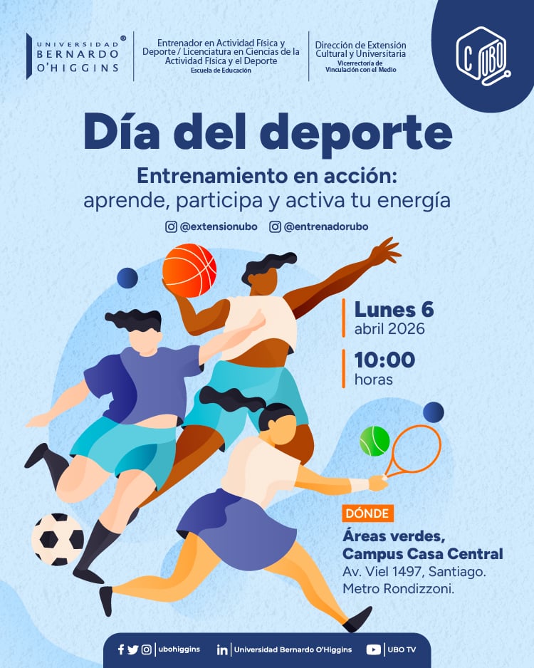 La Dirección de Extensión Cultural y Universitaria, en conjunto con la carrera de Entrenador en Actividad Física y Deporte de la Universidad Bernardo O’Higgins, invita a la comunidad universitaria y al público general a participar en una nueva edición del Día del Deporte, una instancia orientada a promover la vida activa, el bienestar y la participación a través del movimiento.