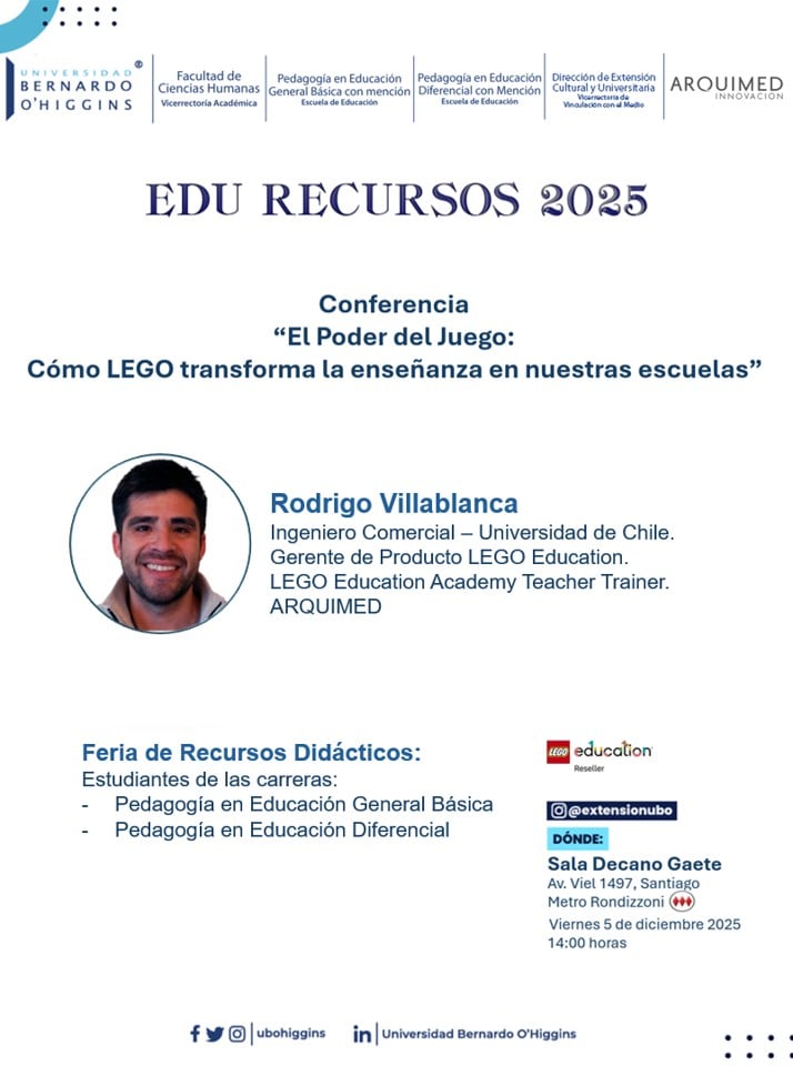 En esta edición, se presentará la conferencia “El Poder del Juego: Cómo LEGO transforma la enseñanza en nuestras escuelas”, dictada por Rodrigo Villablanca, ingeniero comercial de la Universidad de Chile, gerente de producto LEGO Education, LEGO Education Academy Teacher Trainer y representante de ARQUIMED.