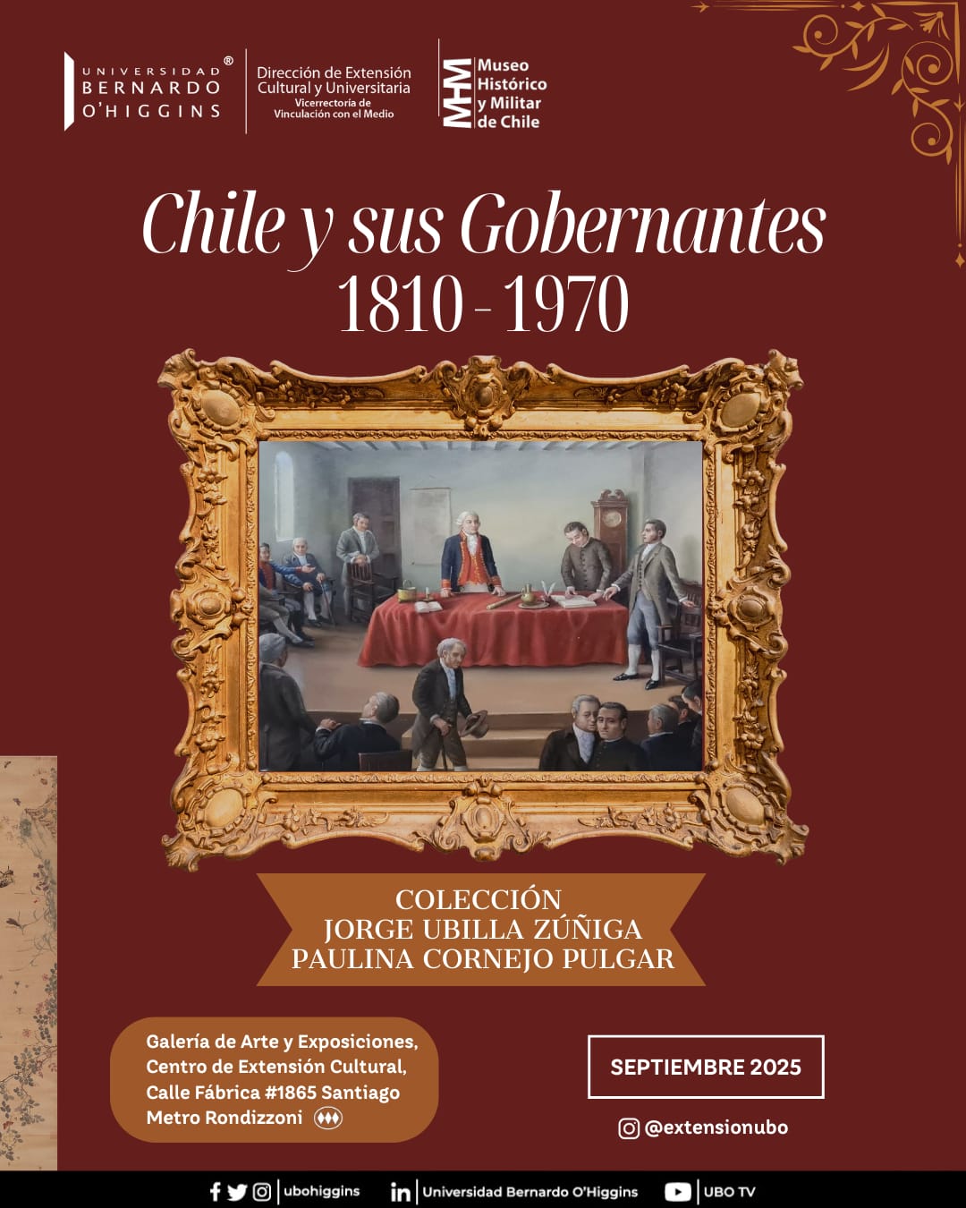 La Dirección de Extensión Cultural y Universitaria de la Universidad Bernardo O’Higgins, en conjunto con el Museo Histórico y Militar de Chile, invita a toda la comunidad a visitar la exposición “Chile y sus Gobernantes 1810-1970”, una muestra que recorre más de 160 años de historia política del país a través de la pintura.