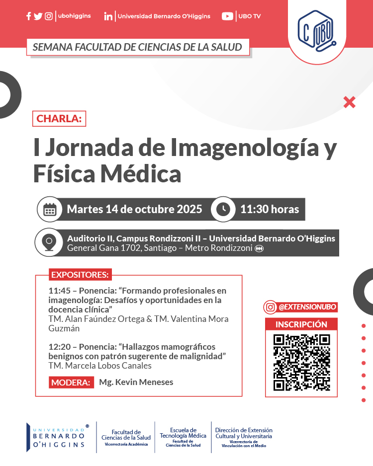 En el marco de la Semana de la Facultad de Ciencias de la Salud, la Universidad Bernardo O’Higgins invita a participar en la I Jornada de Imagenología y Física Médica, un espacio de encuentro académico que busca fortalecer el intercambio de conocimientos y experiencias en el ámbito de la tecnología médica.