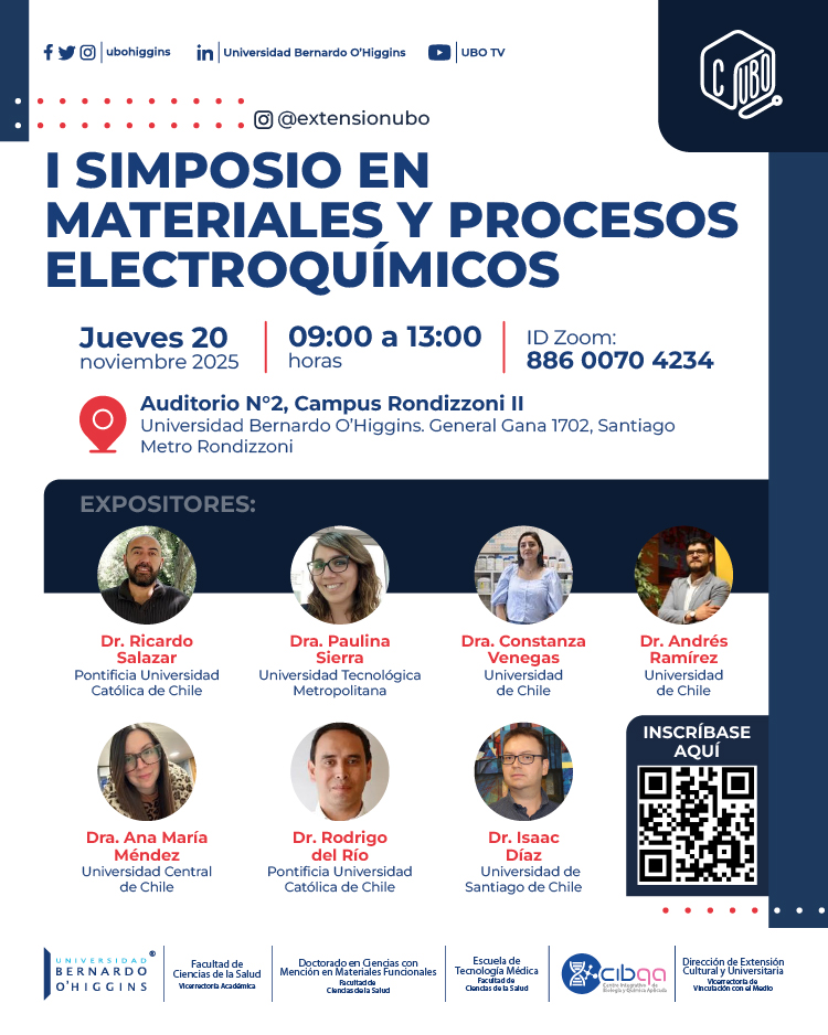 La Dirección de Extensión Cultural y Universitaria de la Universidad Bernardo O’Higgins, a través del Doctorado en Ciencias con Mención en Materiales Funcionales Avanzados, invita a participar en el Primer Simposio en Materiales y Procesos Electroquímicos, una jornada académica que reunirá a destacados investigadores nacionales para abordar los últimos avances en esta área de la ciencia aplicada.
