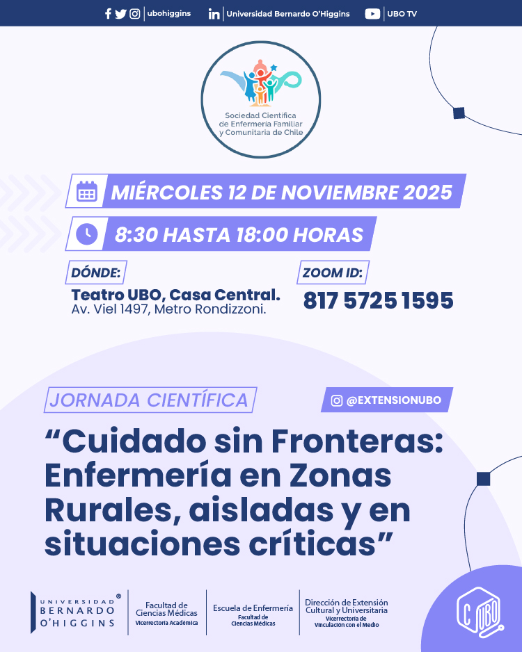 La Escuela de Enfermería de la Universidad Bernardo O’Higgins, en conjunto con la Sociedad Científica de Enfermería Familiar y Comunitaria de Chile (SOCHIENFA) y la Dirección de Extensión Cultural y Universitaria, invita a participar en la Jornada Científica “Cuidado sin Fronteras”, una instancia que busca fortalecer la reflexión, el aprendizaje y el intercambio de experiencias en torno a los desafíos de la atención de salud en contextos rurales y de difícil acceso.