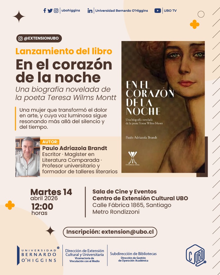 La Dirección de Extensión Cultural y Universitaria de la Universidad Bernardo O’Higgins invita al lanzamiento del libro En el corazón de la noche, una biografía novelada de la poeta chilena Teresa Wilms Montt, escrita por el autor y académico Paulo Adriazola Brandt.