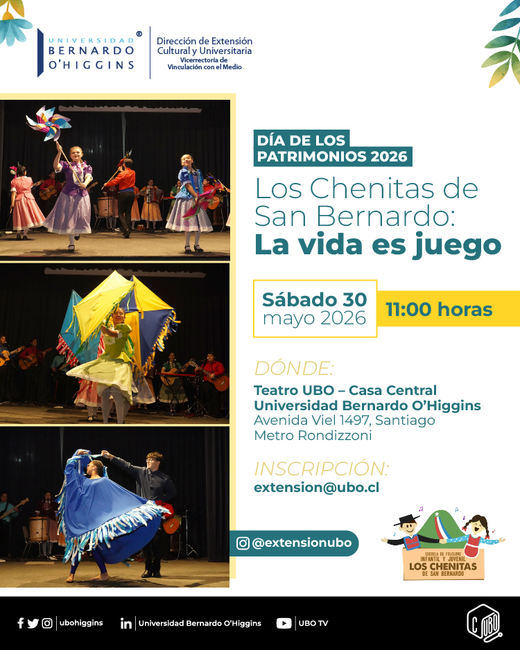 En el marco del Día de los Patrimonios 2026, la Dirección de Extensión Cultural y Universitaria de la Universidad Bernardo O’Higgins invita a la comunidad a disfrutar de la presentación “Los Chenitas de San Bernardo: La vida es juego”, una propuesta artística que pone en valor las tradiciones, el folclor y el patrimonio cultural local.