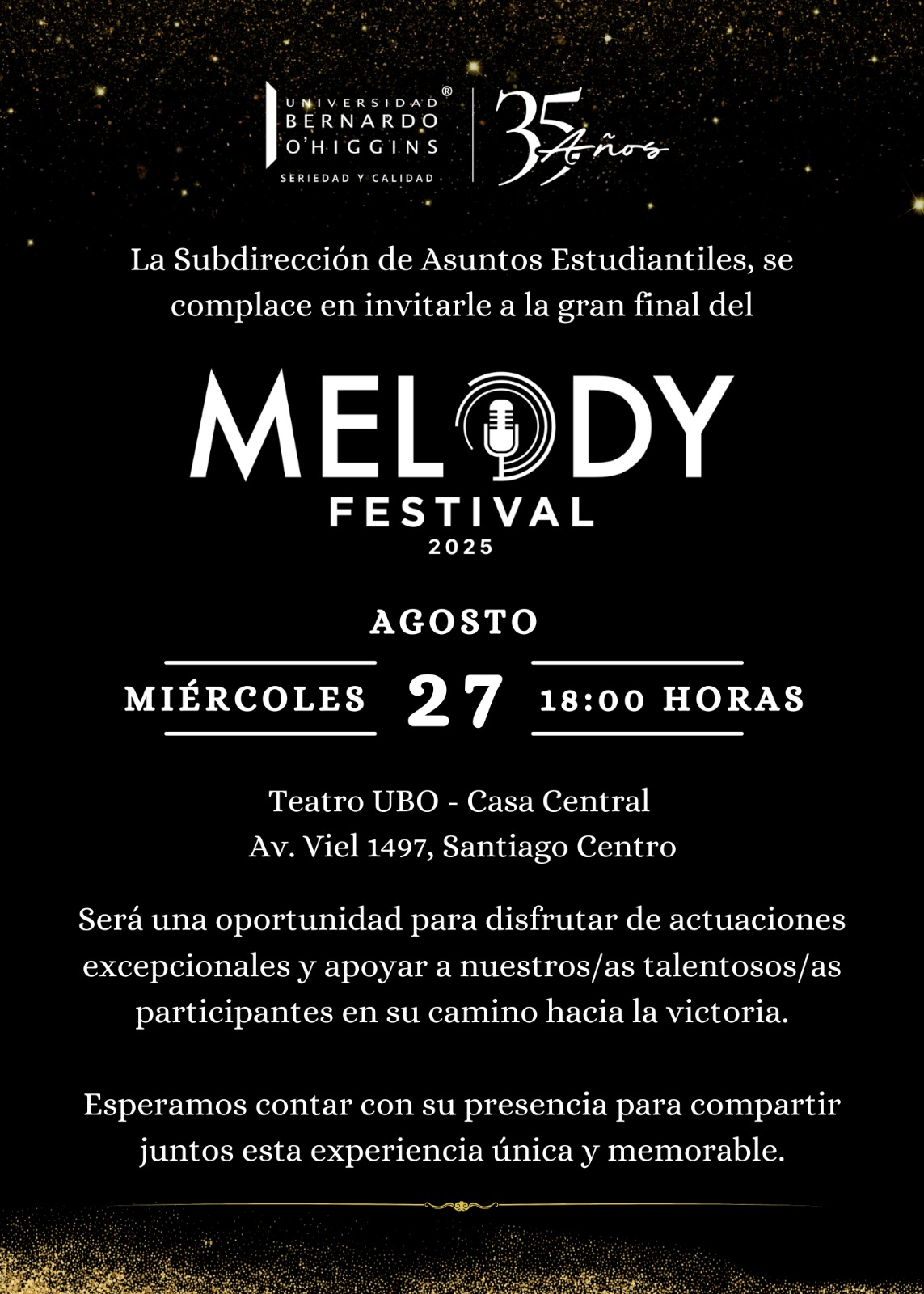 La Universidad Bernardo O’Higgins, a través de la Subdirección de Asuntos Estudiantiles, invita a toda la comunidad a disfrutar de la gran final del Melody Festival 2025, un espacio donde brillará el talento artístico de nuestros y nuestras estudiantes.