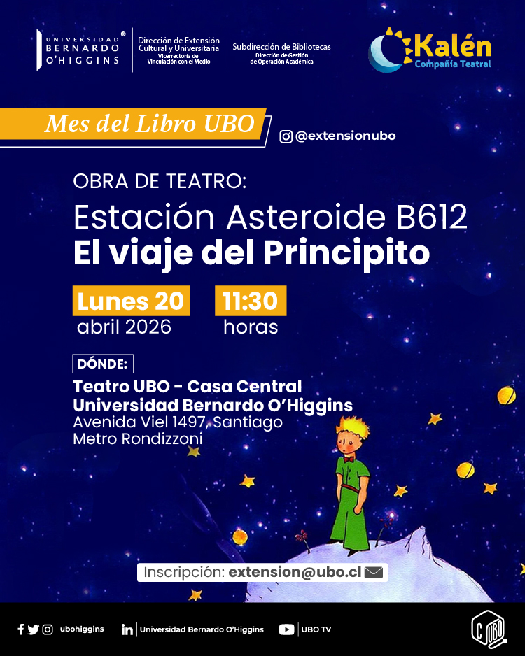 En el marco de la programación del Mes del Libro UBO, la Dirección de Extensión Cultural y Universitaria de la Universidad Bernardo O’Higgins, junto a la Subdirección de Bibliotecas, invita a la comunidad a asistir a la obra de teatro “Estación Asteroide B612: El viaje del Principito”, presentada por la Compañía Teatral Kalén.