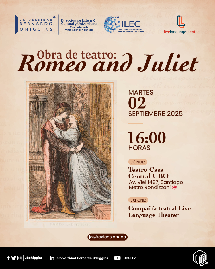 La Universidad Bernardo O’Higgins, a través de su Dirección de Extensión Cultural y Universitaria junto al Instituto de Lenguas Extranjeras y Culturas (ILEC), invita a toda la comunidad a disfrutar de la célebre obra Romeo and Juliet, interpretada por la compañía teatral Live Language Theater.