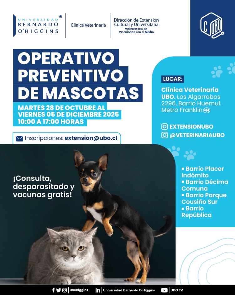 La Universidad Bernardo O’Higgins, a través de su Clínica Veterinaria y la Dirección de Extensión Cultural y Universitaria, invita a los vecinos y vecinas de los barrios Placer Indómito, Décima Comuna, Parque Cousiño Sur y República a participar en el Operativo Preventivo de Mascotas, una jornada gratuita de atención veterinaria destinada exclusivamente a perros y gatos.