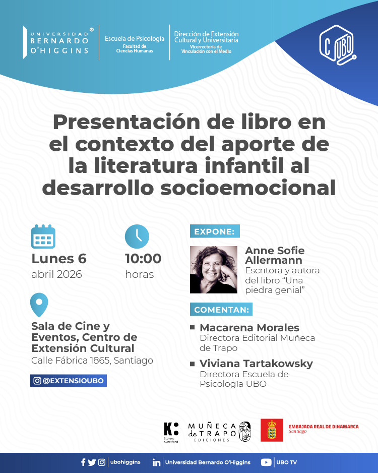 La Universidad Bernardo O’Higgins, a través de la Escuela de Psicología y la Dirección de Extensión Cultural y Universitaria, invita a participar en la presentación del libro “Una piedra genial”, instancia orientada a reflexionar sobre el aporte de la literatura infantil al desarrollo socioemocional en las primeras etapas de la vida.