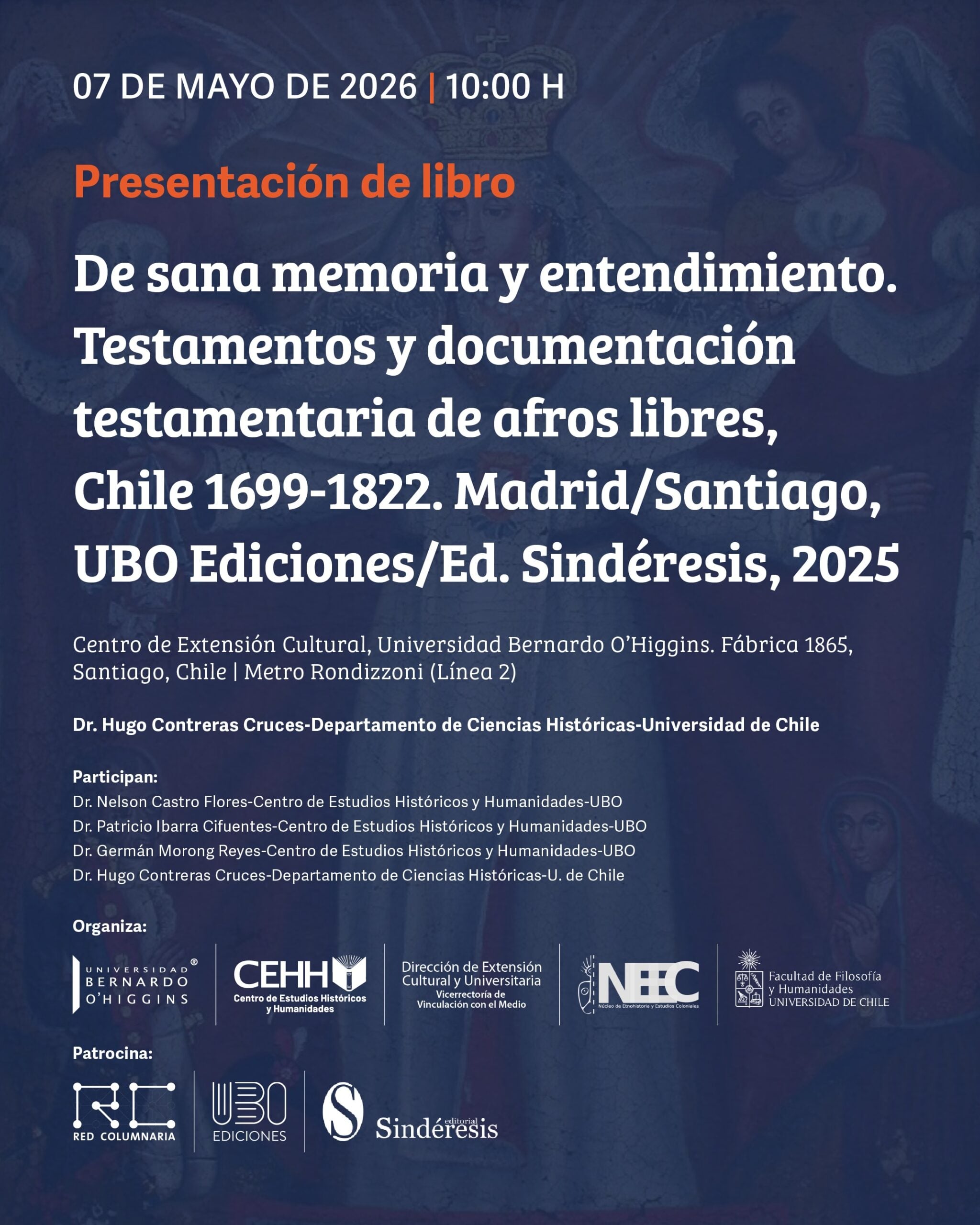 La Universidad Bernardo O’Higgins, a través del Centro de Estudios Históricos y Humanidades en conjunto con la Dirección de Extesnión Cultural y Universitaria, invitan a la presentación del libro “De sana memoria y entendimiento. Testamentos y documentación testamentaria de afros libres, Chile 1699–1822”, una obra que aborda, desde una perspectiva histórica, los procesos sociales, culturales y jurídicos vinculados a las comunidades afrodescendientes en Chile durante el período colonial y comienzos de la República.