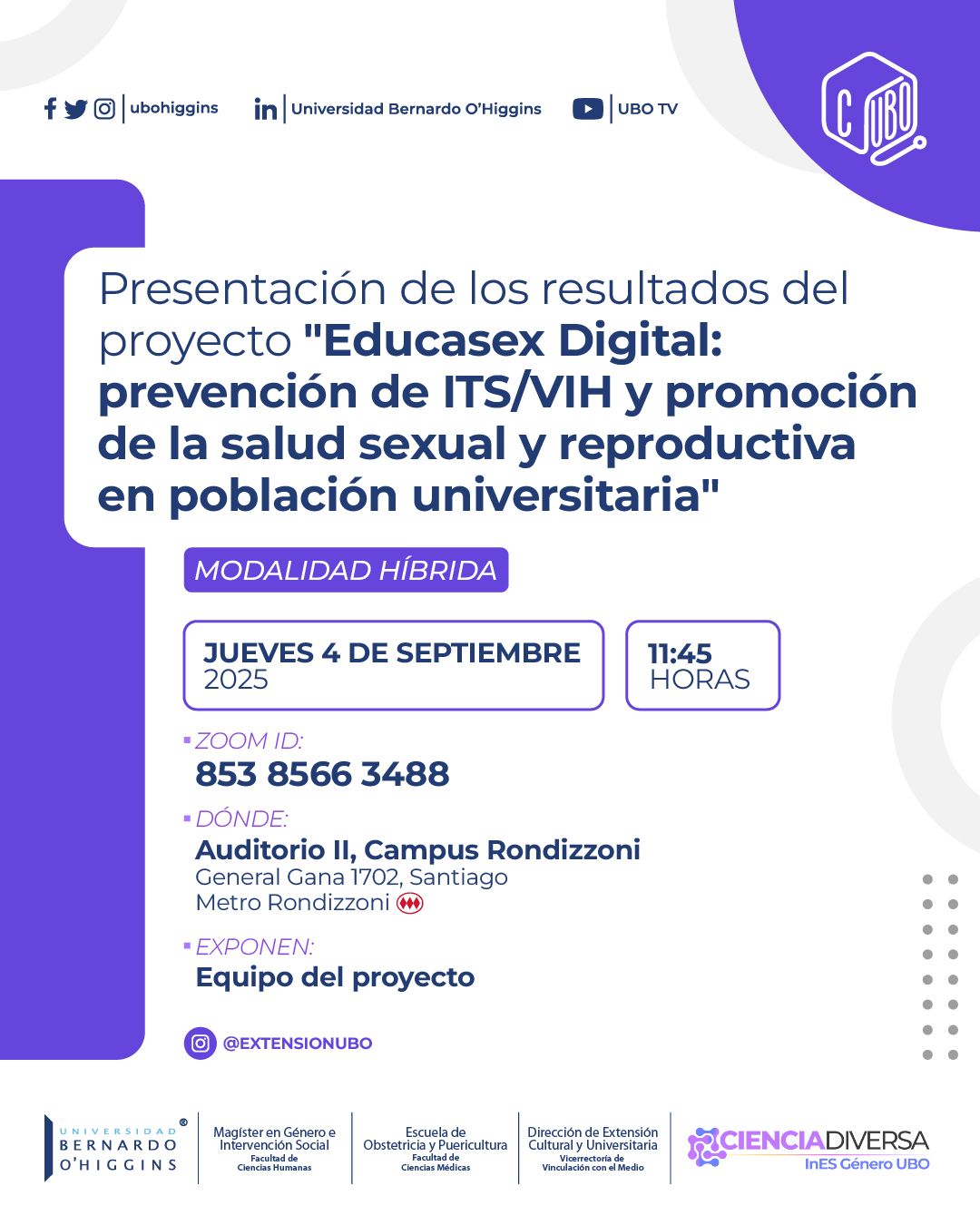 La Universidad Bernardo O’Higgins invita a la comunidad universitaria a la presentación de los resultados del proyecto “Educasex Digital: prevención de ITS/VIH y promoción de la salud sexual y reproductiva en población universitaria”, una iniciativa que busca fortalecer la educación sexual integral desde un enfoque científico, inclusivo y con perspectiva de género.