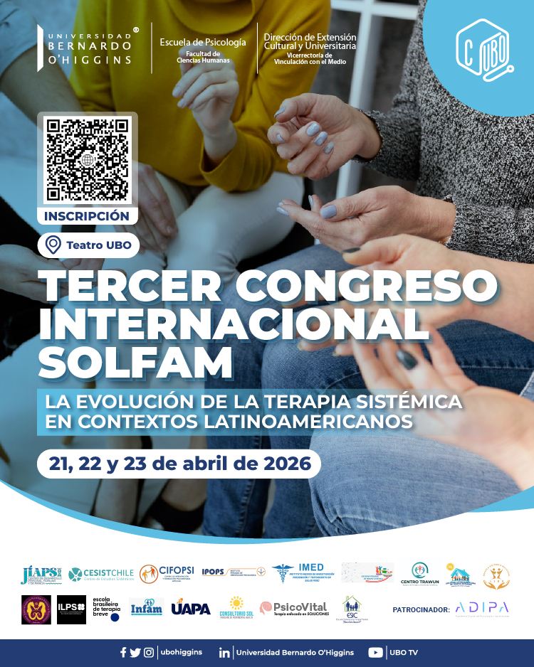 La Universidad Bernardo O’Higgins, a través de su Escuela de Psicología y la Dirección de Extensión Cultural y Universitaria, invita a participar en el Tercer Congreso Internacional SOLFAM, instancia académica que reunirá a destacados profesionales y académicos para reflexionar sobre los avances y desafíos de la terapia sistémica en América Latina.