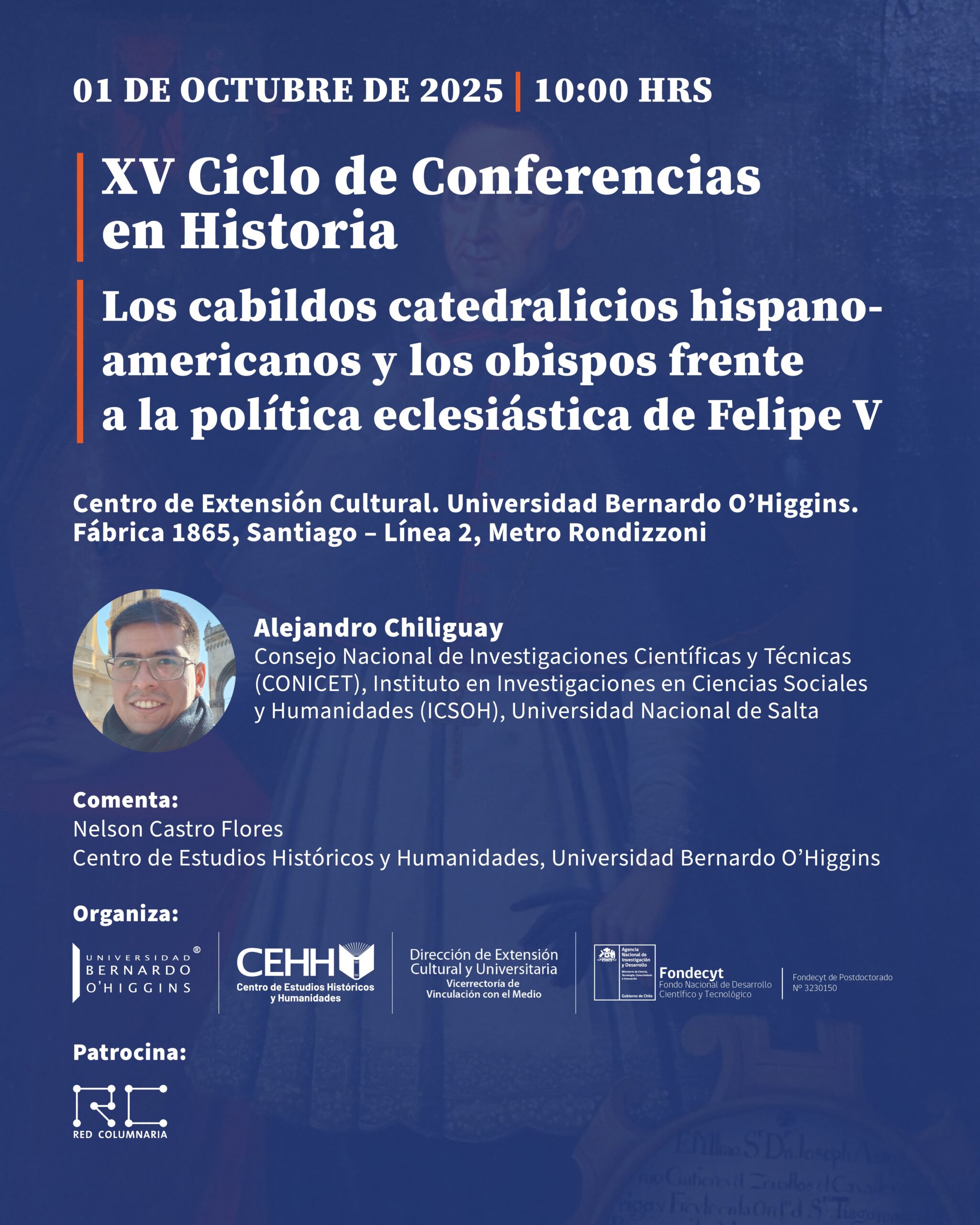 La Universidad Bernardo O’Higgins, a través de su Dirección de Extensión Cultural y Universitaria y el Centro de Estudios Históricos y Humanidades (CEHH), invita a participar del XV Ciclo de Conferencias en Historia, que se llevará a cabo el miércoles 1 de octubre de 2025, a las 10:00 horas, en el Centro de Extensión Cultural, ubicado en calle Fábrica 1865, Santiago (Metro Rondizzoni, Línea 2).