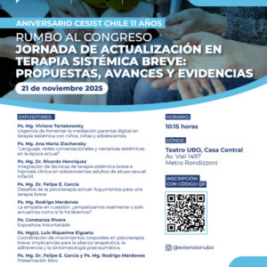 La Escuela de Psicología de la Universidad Bernardo O’Higgins, junto al Centro de Estudios Sistémicos CESIST Chile, invitan a participar en la Jornada de Actualización en Terapia Sistémica Breve: Propuestas, Avances y Evidencias, instancia que se enmarca en el aniversario número 11 de CESIST Chile. Este encuentro reunirá a destacados especialistas nacionales e internacionales, quienes […]