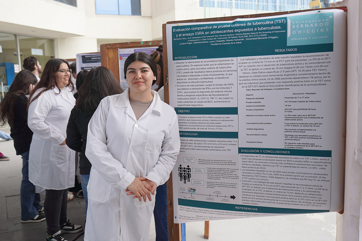En la misma línea, Catherina Muñoz, estudiante de la mención Bioanálisis, explicó: “Nuestro póster comparó dos pruebas para el diagnóstico de tuberculosis latente en adolescentes coreanos expuestos a la enfermedad: la prueba cutánea de tuberculina y el ensayo IGRA. El estudio, realizado en 2.982 jóvenes entre 11 y 19 años, mostró que IGRA presentó una mayor especificidad para detectar infección. Este análisis nos permitió evaluar de manera más precisa la utilidad diagnóstica de ambos exámenes en poblaciones de alto riesgo”.