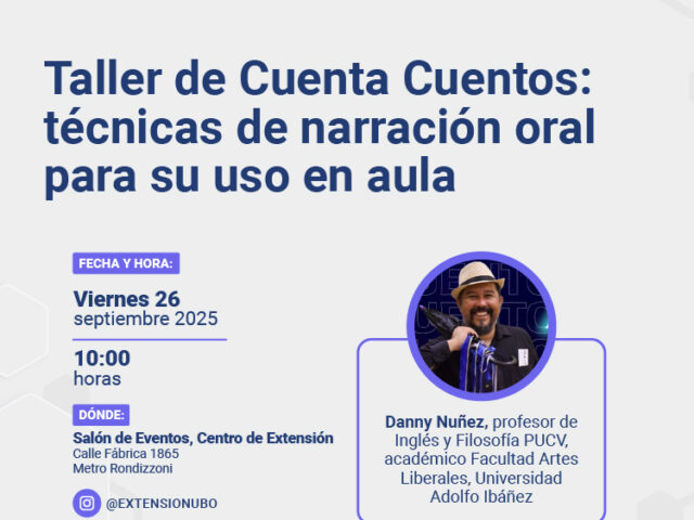 Como parte de la Semana de la Facultad de Ciencias Humanas, te invitamos a participar del Taller de Cuenta Cuentos, una instancia formativa orientada a desarrollar habilidades de narración oral para aplicar en contextos educativos. La actividad será dirigida por Danny Núñez, profesor de Inglés y Filosofía (PUCV) y académico de la Facultad de Artes Liberales...