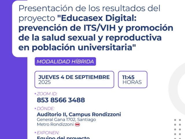 La Universidad Bernardo O’Higgins invita a la comunidad universitaria a la presentación de los resultados del proyecto “Educasex Digital: prevención de ITS/VIH y promoción de la salud sexual y reproductiva en población universitaria”, una iniciativa que busca fortalecer la educación sexual integral desde un enfoque científico, inclusivo y con perspectiva de género. 📅 Fecha: Jueves 4...